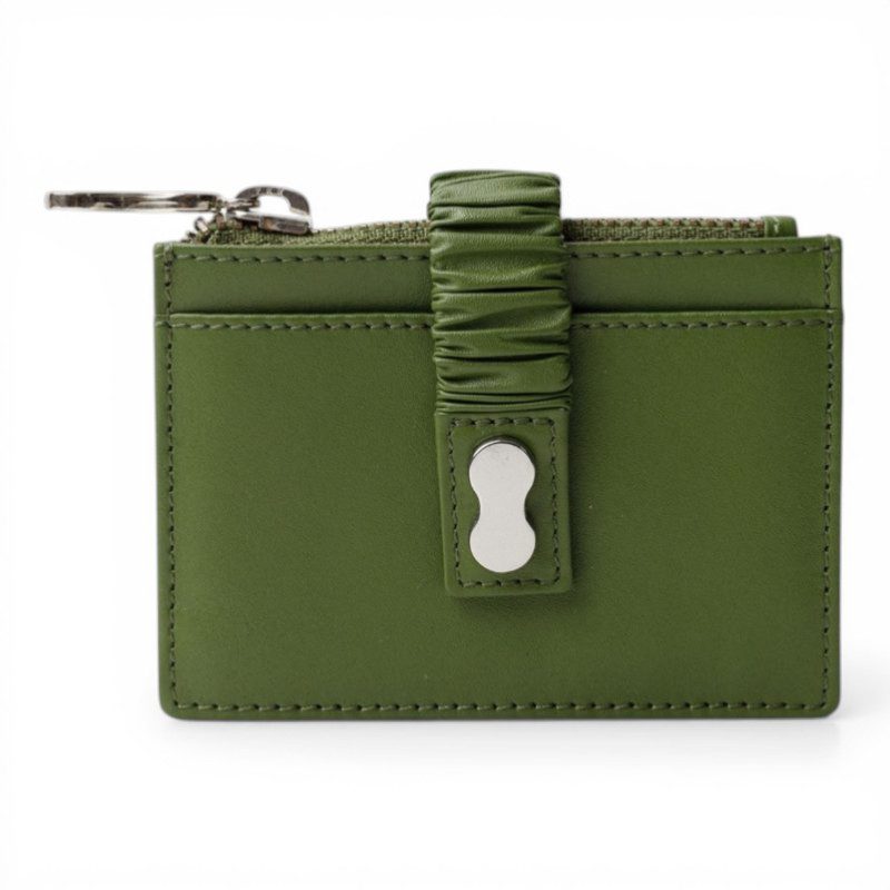 Cartera de piel con cierre de cremallera y abotonado y correa con efecto plisado. Con tarjetero y billetero.