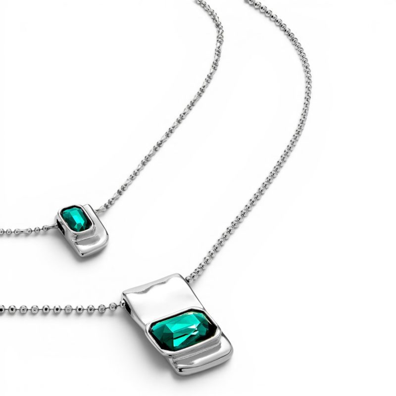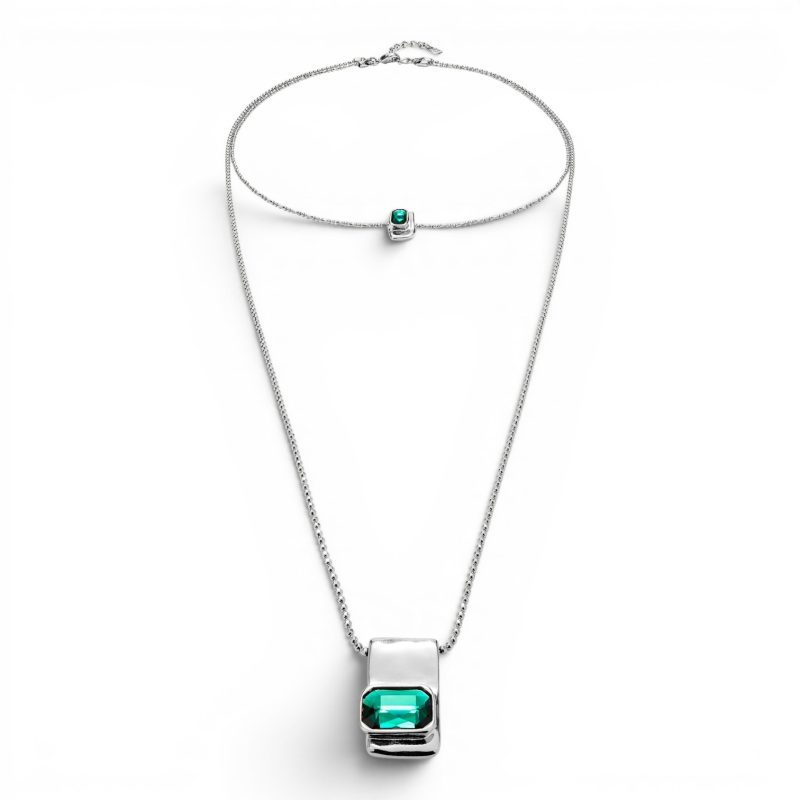 Este collar doble bañado en plata juega con las proporciones y la geometría para crear una pieza tan sofisticada como magnética. Dos cadenas de diferentes longitudes se completan con colgantes geométricos, cada uno con un cristal verde talla esmeralda que aporta profundidad y luz.